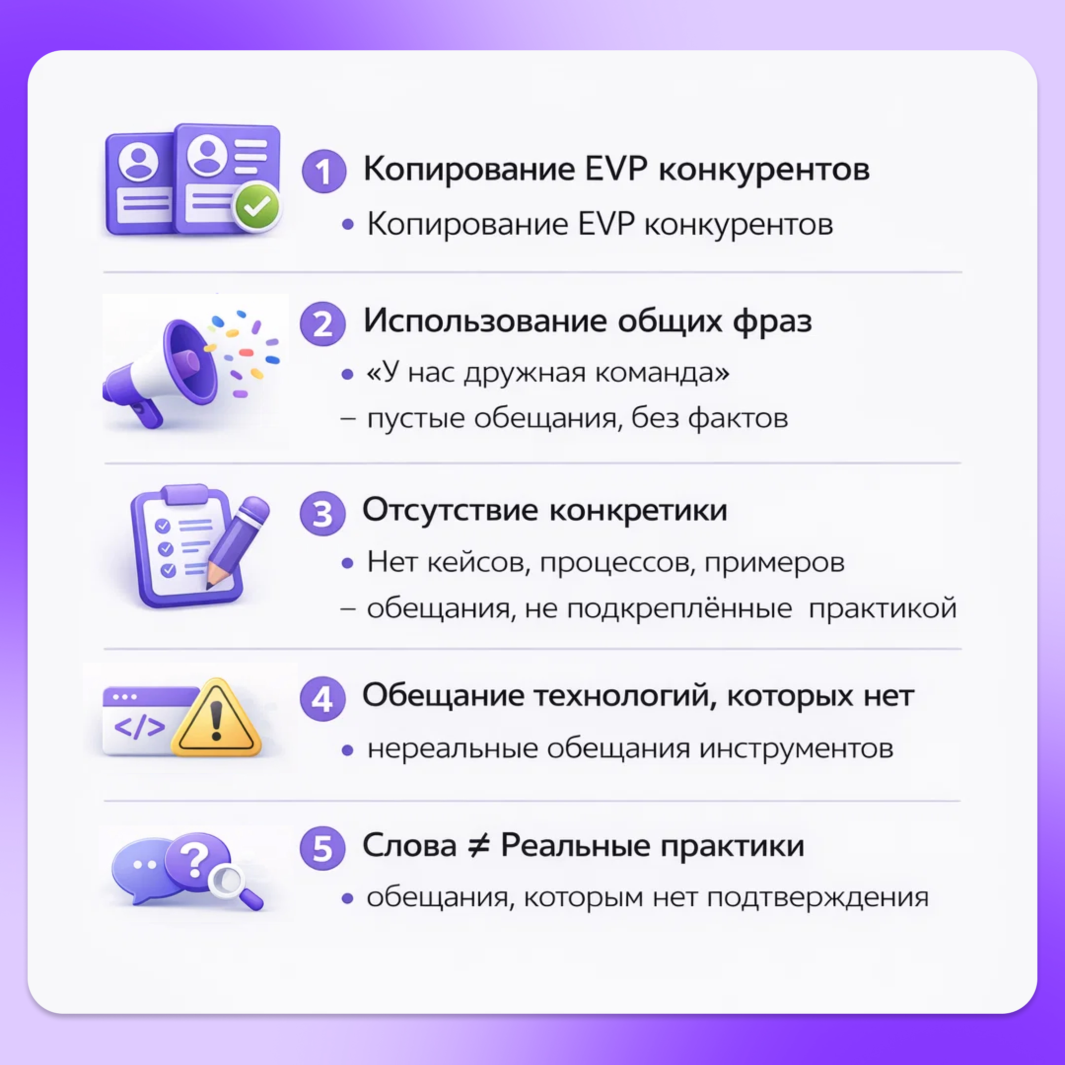 Когда EVP не совпадает с реальностью, компания быстро теряет лояльность сотрудников, и репутация восстанавливается долго.
