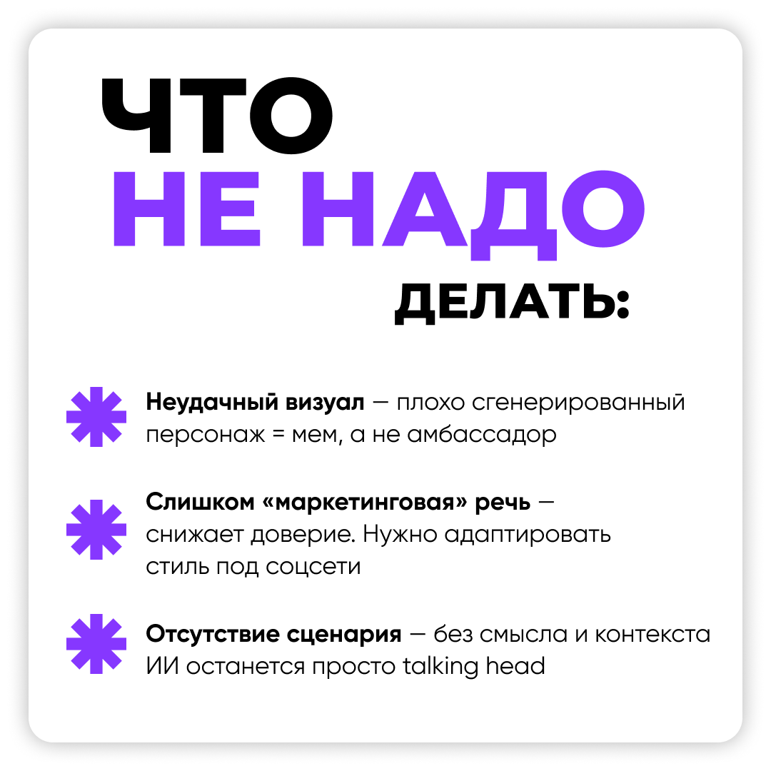 Важно добавлять пометку: «виртуальный амбассадор создан с помощью ИИ» — это честно и повышает доверие.