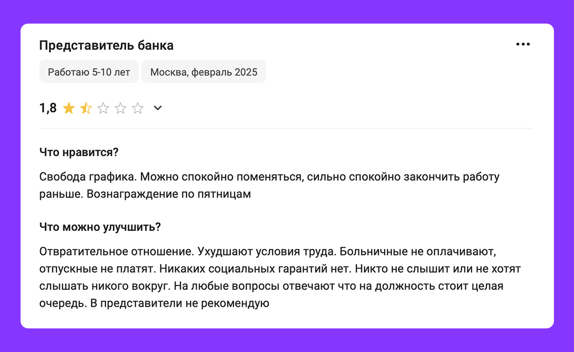 Слишком привлекательное, но нереалистичное EVP быстро разочаровывает сотрудников и увеличивает текучесть кадров. Например, компания обещает гибкий график работы и свободу действий, но на практике сотрудники сталкиваются с жесткими рамками и микроменеджментом.