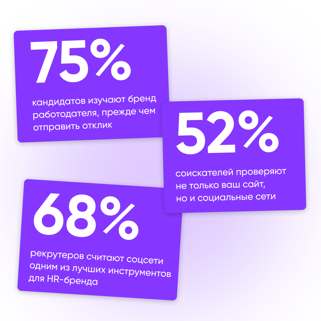 Главная сложность, с которой люди сталкиваются в поисках работы, — это непонимание, что их на самом деле ждет. Вот почему отзывам реальных людей они доверяют в 3 раза больше, чем «официальным» заявлениям. Соцсети как раз помогают «сломать четвертую стену» и разрушить барьер недоверия между соискателями и картинкой, которую рисует бренд.