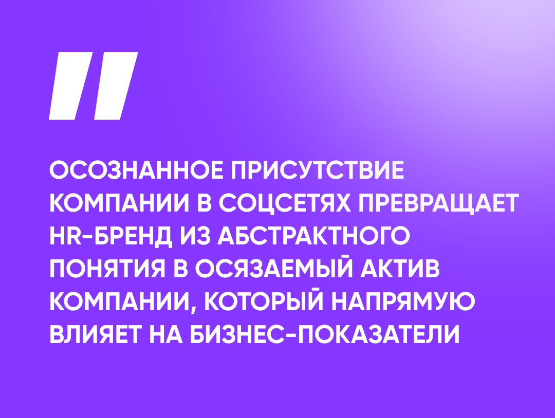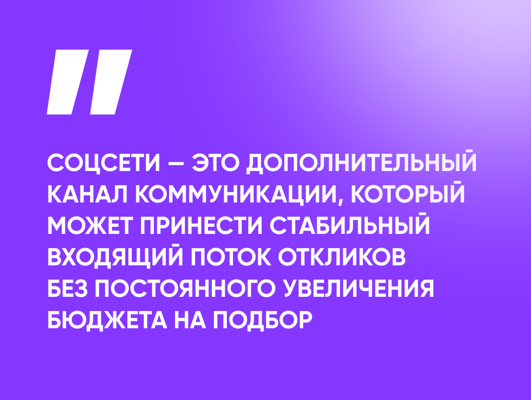 Социальные сети дают возможность быстро реагировать на смену настроений, отвечать на вопросы и комментарии, демонстрируя открытость. Своевременное информирование об изменениях и новостях создает ощущение стабильности даже в периоды трансформаций и общей «тряски» рынка. А регулярные публикации о корпоративных ценностях, преимуществах работы, возможностях для развития и просто «внутрянке» позволяют выделиться на фоне конкурентов.