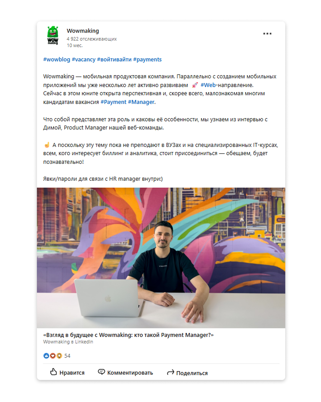 Почему так происходит? Ответ кроется в самом термине «социальные сети» — ведь в первую очередь это инструмент для общения между людьми. Демонстрируя в кадре тех, кто скрывается за рабочими функциями и должностными инструкциями, мы устанавливаем более доверительный контакт, показываем «внутрянку» офисной жизни и можем привлечь людей, с которыми случится мэтч не только на уровне задач, но и на уровне корпоративной культуры.