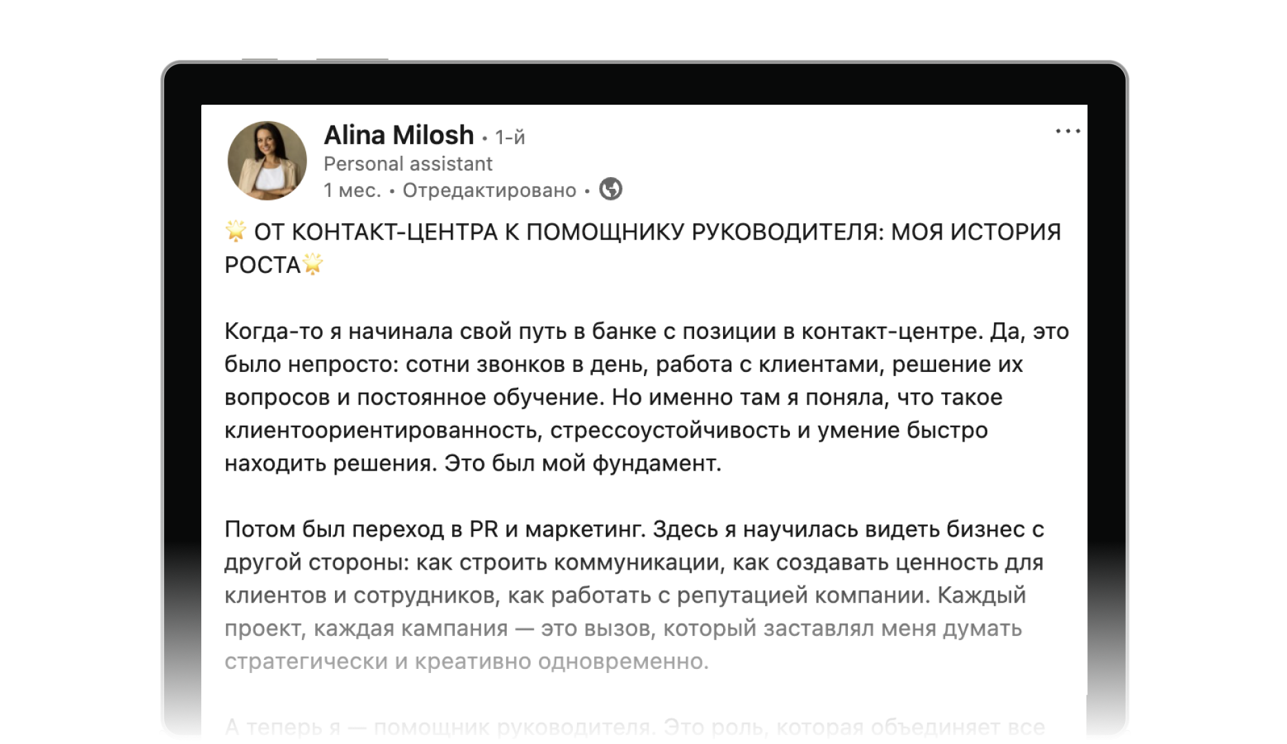 «Мы — динамично развивающаяся компания, ценим инициативу и командную работу». Это описание подходит к 90% работодателей — и не даёт никакого представления о том, кто вы. Превратите шаблон в живую историю.