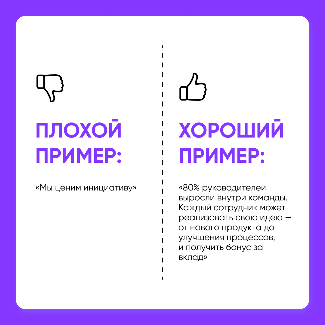 - было понятно и ценно для ЦА (не просто «дружный коллектив», а что конкретно делает атмосферу крутой)