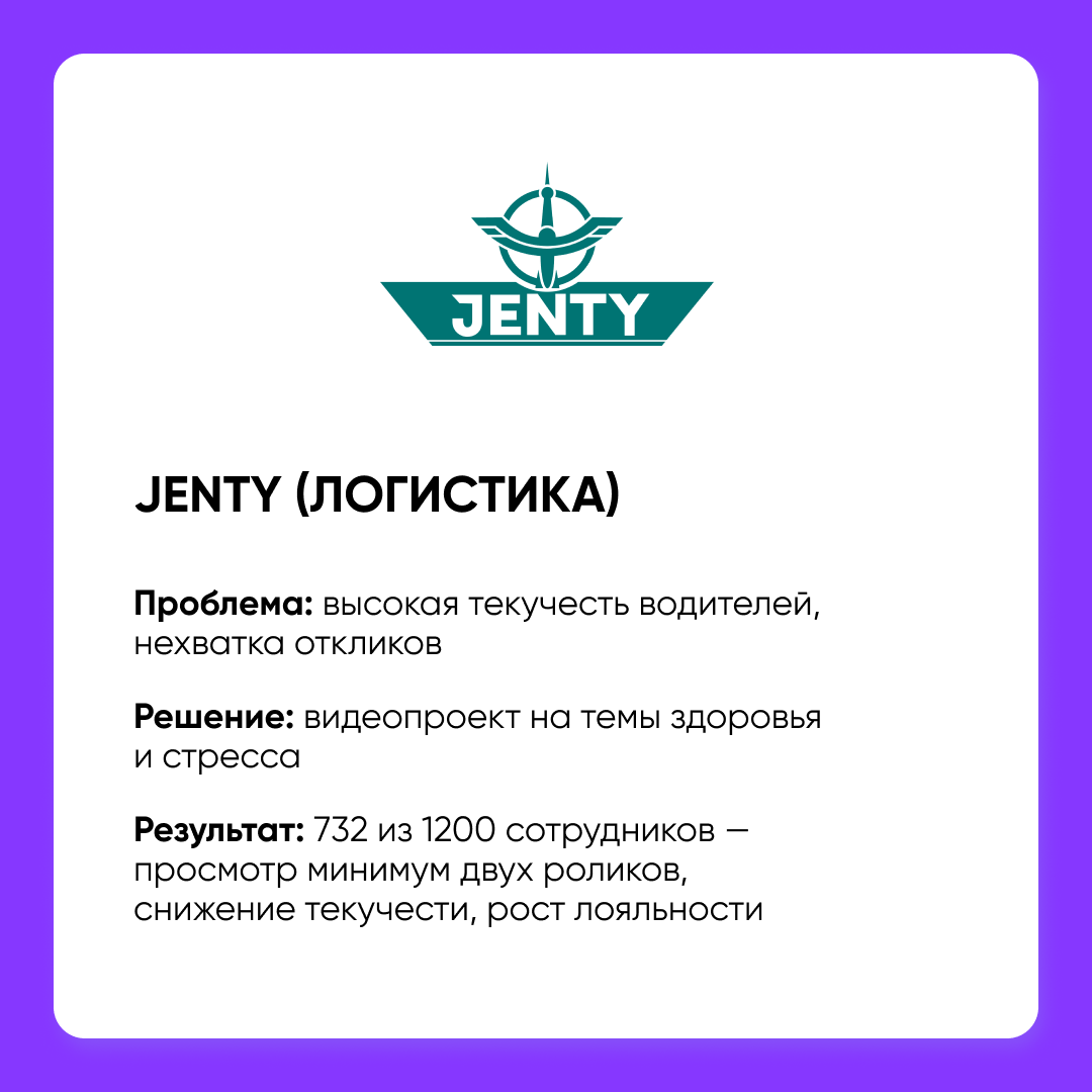 Например, для JENTY была запущена кампания на водителей в регионах — и 732 из 1200 сотрудников просмотрели как минимум два видео, направленных на здоровье, питание и стрессоустойчивость.