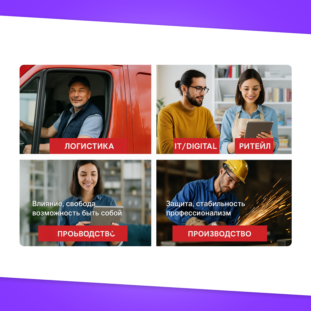 Один и тот же холдинг привлекает IT-специалистов на цифровую платформу и логистов на склады. Контент, каналы, язык общения будут отличаться — но ценности останутся общими.