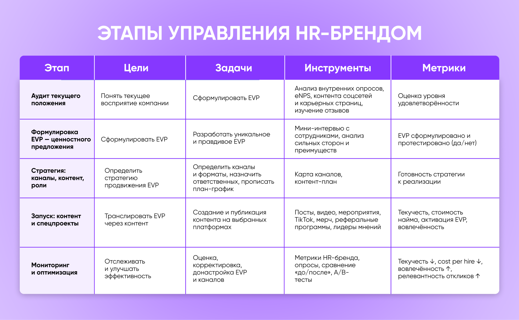 Формирование репутации нанимателя — это не отдельная SMM-стратегия и не пара корпоративов в году. Это системный подход, который включает: